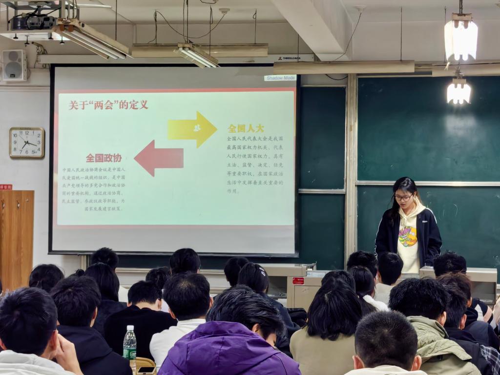 2501班班长张韶涵以 “十五五” 开局之年为背景,锚定高质量发展、新质生产力、民生保障三大主线,用通俗易懂的语言,把国家大政方针与青年成长成才紧密结合,既清晰解读了国家发展取得的丰硕成就,又透彻阐释了新时代青年肩负的时代使命,让同学们读懂国家发展大势与个人成长的紧密联系。2502班班长曹恩华以“两会核心精神”为焦点,结合人工智能专业特点向同学们提出了具体的精神践行路径,鼓励大家立足专业所长,主动在科技创新、乡村振兴、绿色发展等领域找准定位、贡献青春力量。
