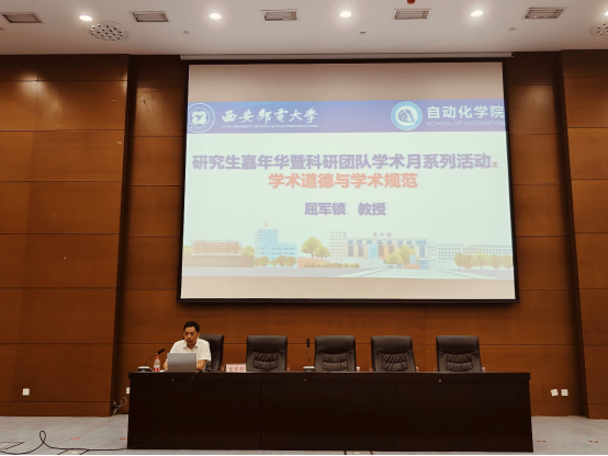 屈军锁介绍活动安排,并作“学术道德学术规范”专题讲座,深刻阐述学术道德与规范的核心要义,强调坚守学术诚信是治学根本。他号召全体师生维护学术尊严,杜绝学术不端行为,共同守护求真求实的学术净土。