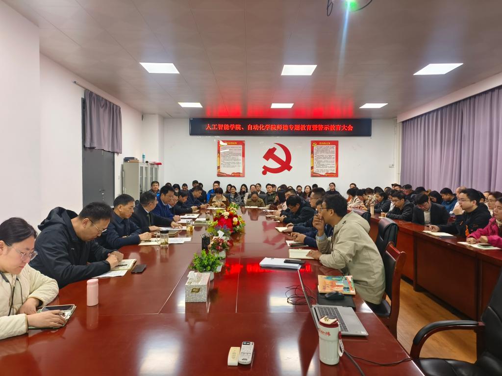 为深入贯彻落实立德树人根本任务,巩固拓展师德专项教育成效,全面提升学院教师思想政治素质与职业道德水平,按照学校相关文件精神及工作安排,10月23 日,人工智能学院、自动化学院召开师德专题教育大会,学院全体教职工参加会议,会议由党委书记李向伟主持。