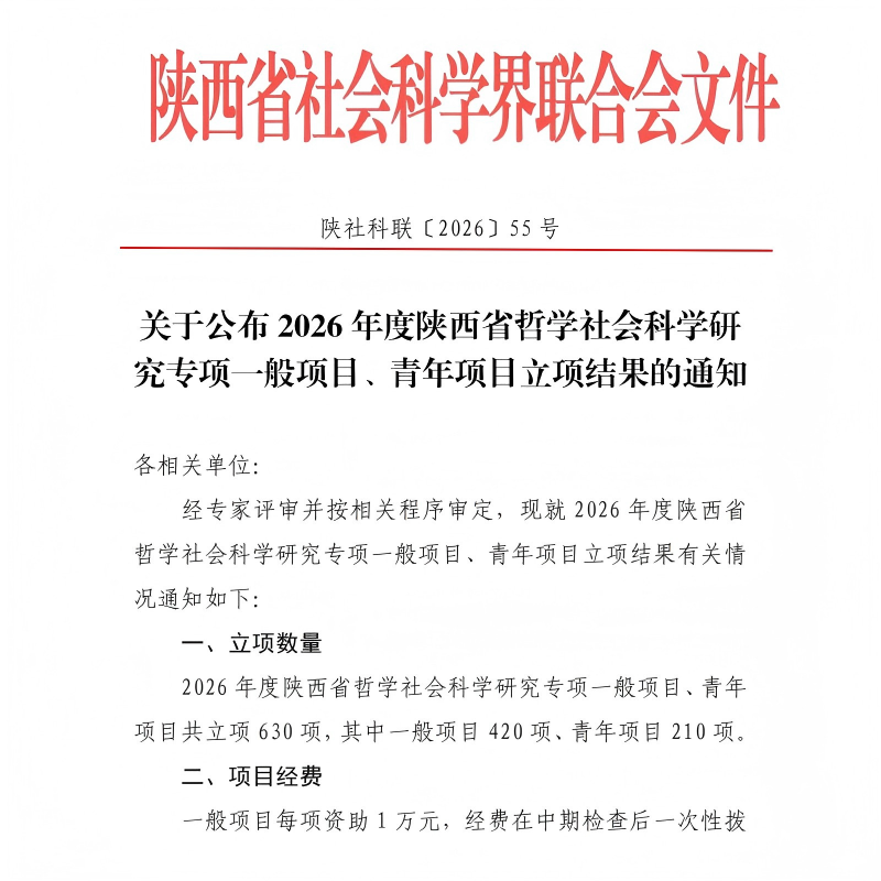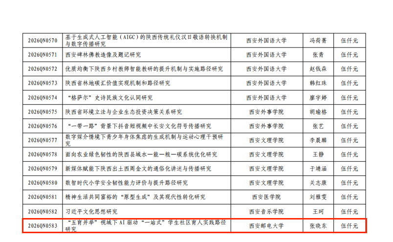 近日,陕西省社会科学界联合会正式公布2026年度陕西省哲学社会科学研究专项立项结果,人工智能学院、自动化学院张晓东老师主持申报的《“五育并举”视域下AI驱动“一站式”学生社区育人实践路径研究》项目,成功获批青年项目立项。