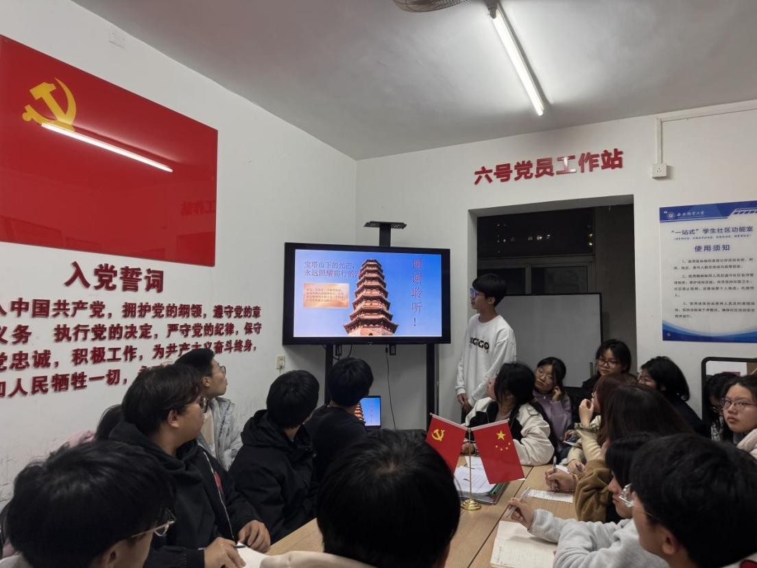 为深入推进“一站式”学生社区建设,引导广大青年学子从红色基因中汲取奋进力量,2026年3月15日,六号党员工作站在长智公寓六号楼135开展“赓续精神血脉,凝聚奋进力量”延安精神专题学习活动。本次活动由学习部李锦鹏同学主讲。他围绕延安精神的历史背景、核心内涵、典型体现与时代价值四个方面进行讲解,带领同学们走进那段峥嵘岁月,感悟伟大精神的时代回响。